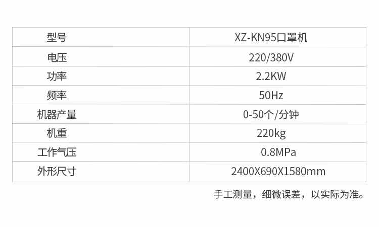 名稱XZ-KN95口罩機 電源220/380v 功率2.2kw 產(chǎn)量0-50個/分鐘 尺寸2400*690*1580MM 重量220kg 規(guī)格頻率50HZ 其他氣壓0.8mpa