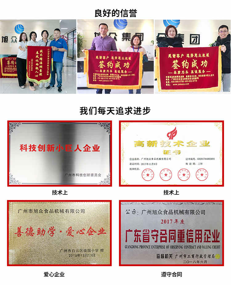 廣州旭眾食品機械有限公司是一家集科研開發(fā),生產(chǎn)設(shè)計,營銷服務(wù)為一體的現(xiàn)代化生產(chǎn)企業(yè)。現(xiàn)代化生產(chǎn)車間,精湛制造技術(shù),所產(chǎn)機械歷經(jīng)市場重重考驗,不斷贏得海內(nèi)外客戶的贊譽。