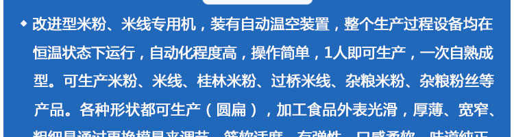 SZ-300多功能米粉機(jī),生產(chǎn)多樣性可生產(chǎn)米粉、米線、粉絲、粉條、、年糕、玉米面條、各種雜糧粉絲、各種面條、雜糧面條、彩色面條以及以紅薯、玉米、大豆、蠶豆等制成淀粉為原料的等多種食品而且每種食品厚薄、粗細(xì)等規(guī)格可根據(jù)需要任意調(diào)整。