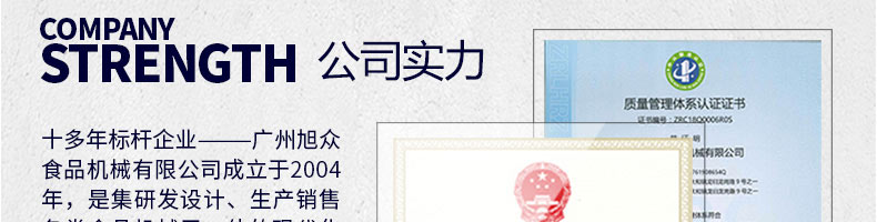 廣州旭眾食品機(jī)械有限公司是一家集科研開(kāi)發(fā),生產(chǎn)設(shè)計(jì),營(yíng)銷服務(wù)為一體的現(xiàn)代化生產(chǎn)企業(yè)?,F(xiàn)代化生產(chǎn)車間,精湛制造技術(shù),所產(chǎn)機(jī)械歷經(jīng)市場(chǎng)重重考驗(yàn),不斷贏得海內(nèi)外客戶的贊譽(yù)。