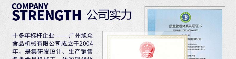廣州旭眾食品機械有限公司是一家集科研開發(fā),生產(chǎn)設計,營銷服務為一體的現(xiàn)代化生產(chǎn)企業(yè)?,F(xiàn)代化生產(chǎn)車間,精湛制造技術(shù),所產(chǎn)機械歷經(jīng)市場重重考驗,不斷贏得海內(nèi)外客戶的贊譽。